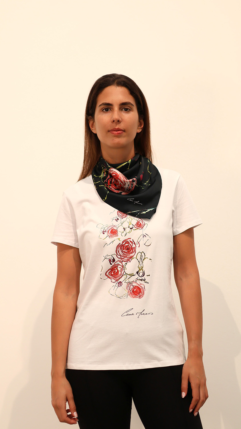 Esta camiseta lleva al frente el estampado más representativo de la colección, donde orquídeas tropicales y camelias atlánticas se entrelazan en una danza delicada entre dos mundos. Situado en el centro del torso, este jardín actúa como una especie de amuleto: suave, femenino, vibrante… una floración constante sobre la piel.